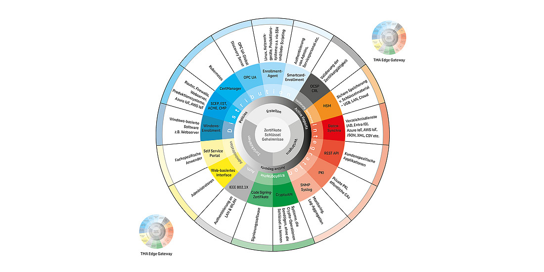 Im Rahmen der Automatisierungsfachmesse SPS haben wir die neue Lösung Trust Management Appliance (TMA) Edge Gateway vorgestellt. Dabei handelt es sich um eine kompakte Softwarelösung für das Ausrollen und Verwalten von Zertifikaten, die auf Edge Devices eingesetzt werden kann. Da kein Administrationsaufwand anfällt und vor Ort kein spezielles IT-Know-how erforderlich ist, eignet sich das TMA Edge Gateway beispielsweise auch für den Einsatz im Umfeld von Produktionsanlagen, bei Auftragsfertigern im In- und Ausland oder in Außenstellen.