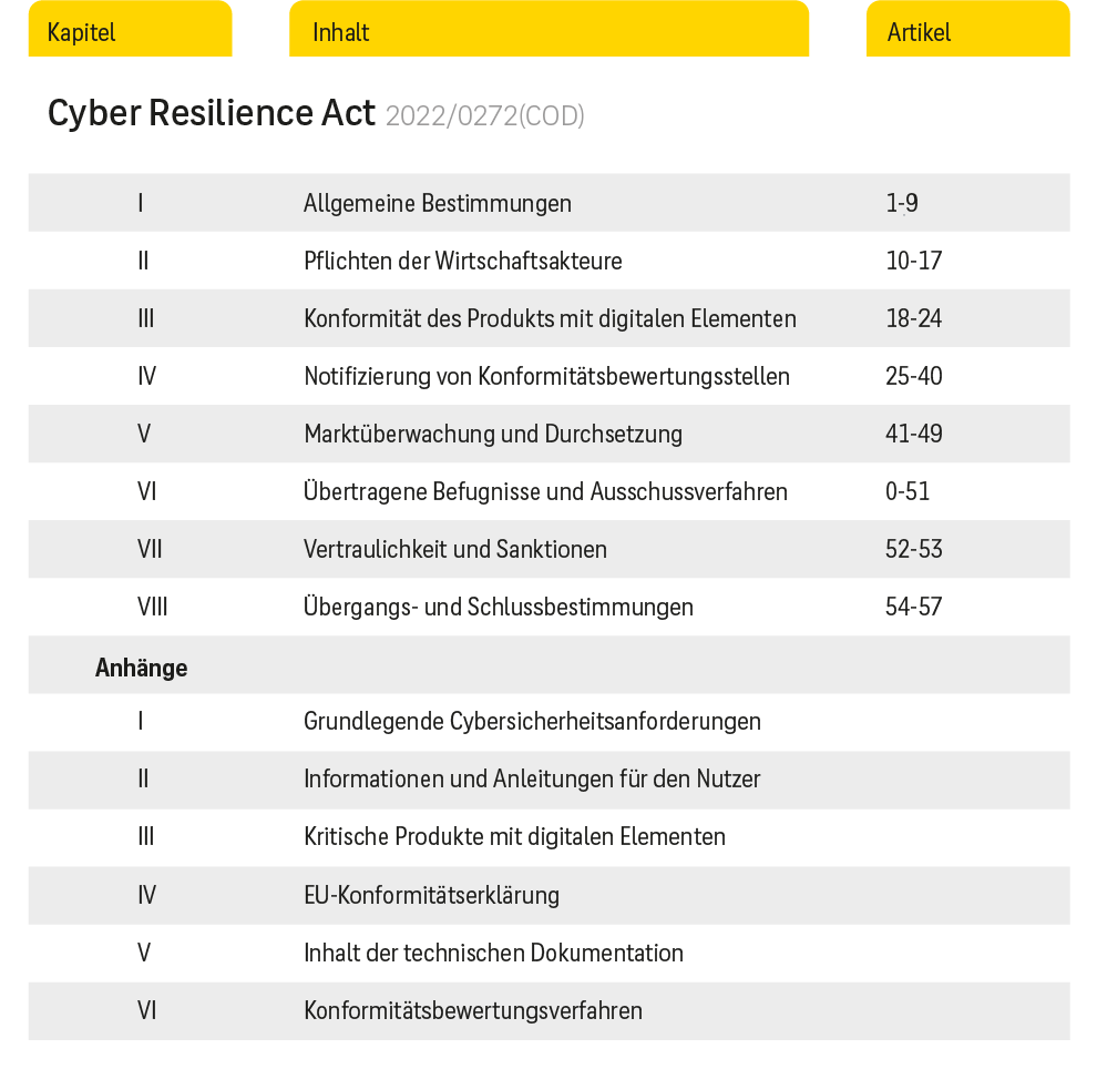 - Design, Entwicklung und Herstellung von Hard- und Softwareprodukten müssen grundlegende Cybersicherheitsanforderungen erfüllen.