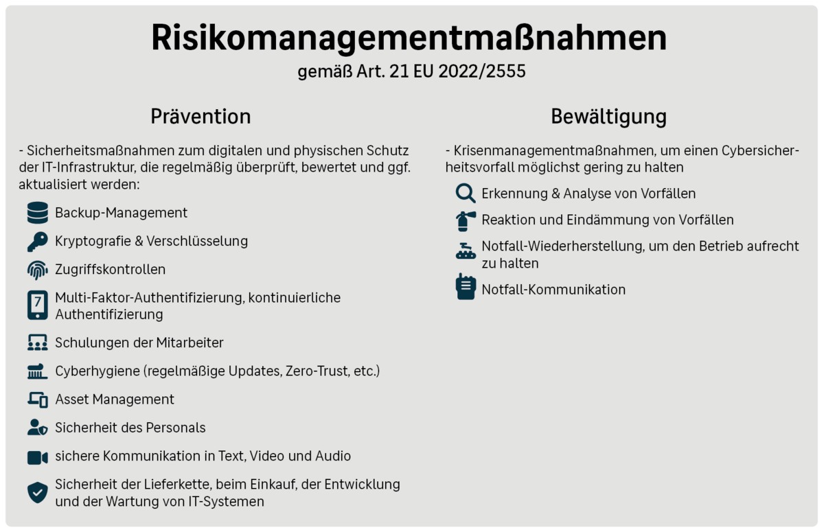 Unternehmen und Organisationen müssen selbst prüfen, ob sie unter die oben genannten Sektoren und Einrichtungen fallen. Sind sie betroffen, müssen sie Risikomanagementmaßnahmen für die digitale und auch physische Sicherheit der Netz- und Informationssysteme einführen. Die Maßnahmen sollen angemessen und risikobasiert sein und den aktuellen Stand der Technik berücksichtigen. Die Verhältnismäßigkeit sollen die Einrichtungen anhand des Ausmaßes der Risikoexposition, der Größe der Einrichtung und der Wahrscheinlichkeit für das Eintreten von Sicherheitsvorfällen und deren Schwere bewerten.