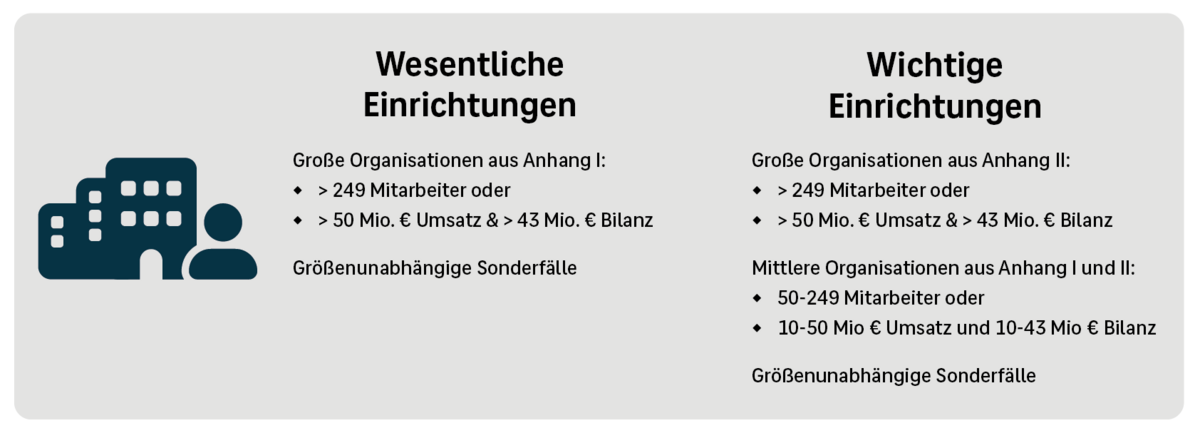 Zu den wesentlichen Einrichtungen zählen private und öffentliche Organisationen aus Anhang I, die mindestens 250 Mitarbeiter beschäftigen, einen Jahresumsatz von mindestens 50 Millionen Euro haben und ihre Dienste in der EU anbieten. Zu den wichtigen Einrichtungen zählen zum einen öffentliche und private Organisationen aus Anhang I oder II, die zwischen 50-249 Mitarbeiter beschäftigen, einen Jahresumsatz von 10-50 Millionen Euro haben und ihre Dienste in der EU anbieten. Zum anderen gehören zu den wichtigen Einrichtungen große Organisationen aus Anhang II, die mindestens 250 Mitarbeiter beschäftigen oder mindestens 50 Millionen Euro Umsatz im Jahr generieren.