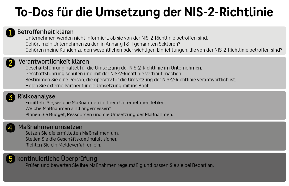 Für Unternehmen gilt also, sich frühzeitig um die Umsetzung der Risikomanagementmaßnahmen zu kümmern. Wichtig ist nun, die eigene Betroffenheit zu klären, die Verantwortlichkeiten festzulegen und fehlende Maßnahmen zu ermitteln und umzusetzen.
