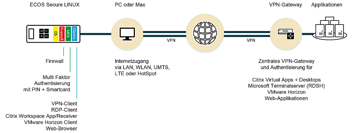 - RDP-Client, Citrix Workspace App (Citrix Receiver), VMware Horizon per RDP, PCoIP, BLAST, Firefox, Chromium, VNC Viewer, VPN-Client für IPsec