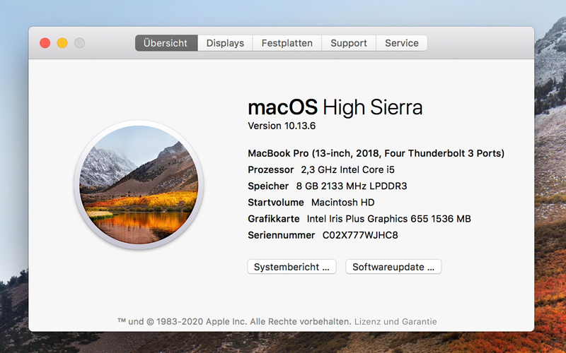 - Nun öffnet sich die App Systeminformation, in der Sie die genaue Modellbezeichnung, den eingebauten Prozessor und die verbaute Grafikkarte einsehen können